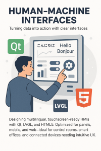 We design modern, multilingual human-machine interfaces (HMIs) for embedded devices using Qt, LVGL, and HTML5. Whether touchscreen, web-based, or mobile-linked, our HMIs provide intuitive control and status feedback for technical and non-technical users alike.